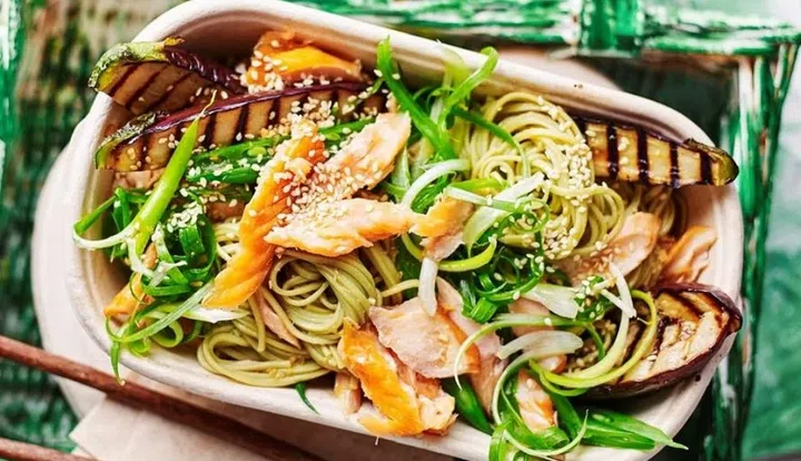 Lighten up your feast with a feel-good fusion salad dish such as this, classically flavoured with sweet soy and ginger dressing for a balanced and tasty appetiser. Instead of the usual greens, this recipe includes smoked trout with eggplant and green tea noodles – emphasising an appealing Asian flair that sticks out from your typical bowl of fresh veggies.