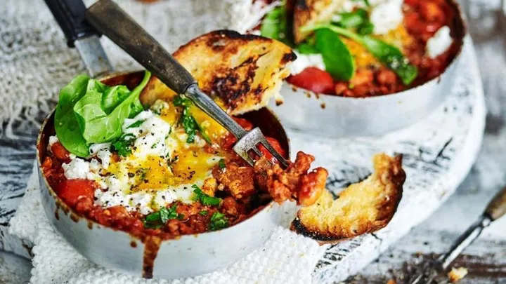 Love all-day brunch options? Check out this savoury dish with bolognese sauce, chorizo beans, and eggs that brings to mind the Middle Eastern shakshuka.