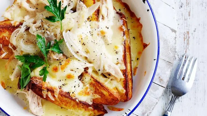 Taking baked potatoes to the next level, this no-frills French Canadian poutine recipe is at once simple, quick and packed with bags of fresh wholesome flavour. To save time, you can use rotisserie chicken from your nearest supermarket or grocer.