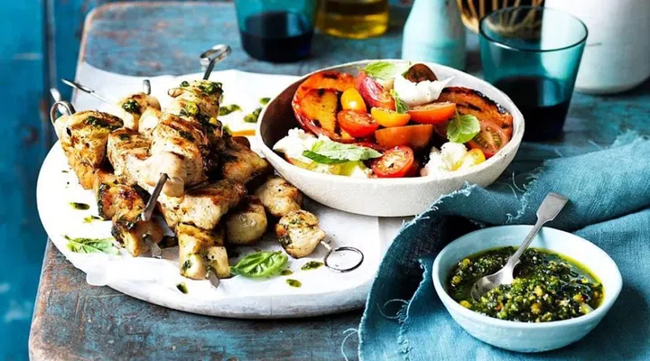 Like the classic Caprese salad? Now, give its fruitier permutation a try, elevated with the tart and sweet flavours of peach, and paired heartily with a side of smoky chicken skewers.