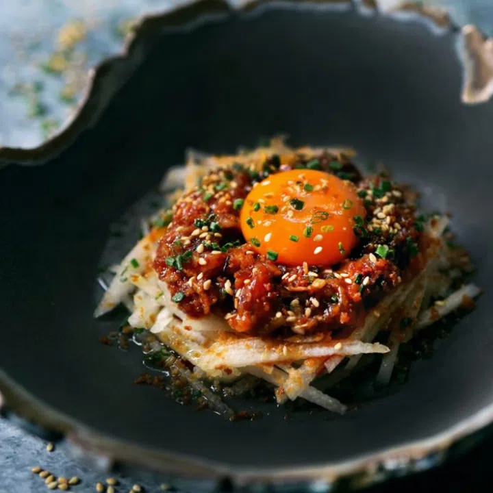 The first course is a beef tartare that uses ribeye cap — a leaner cut that lends a bit of chew — and is seasoned with gochujang, sesame oil, soy sauce and a squeeze of lime. Sitting on a crunchy, sweet nest of Japanese pear, fried garlic, sesame seeds, chives and croutons, and topped with a confit egg yolk, it is a powerhouse of both flavour and texture.