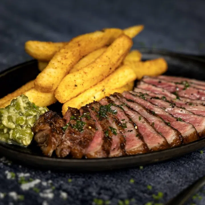 Prepared the same way as the ribeye, and paying homage to its Japanese origins with a dollop of kizami wasabi, where wasabi root is marinated in soy sauce and then chopped (instead of grated) for gentler heat. Thick-cut fries tossed with shichimi seven-spice powder will surely quell any residual hunger.