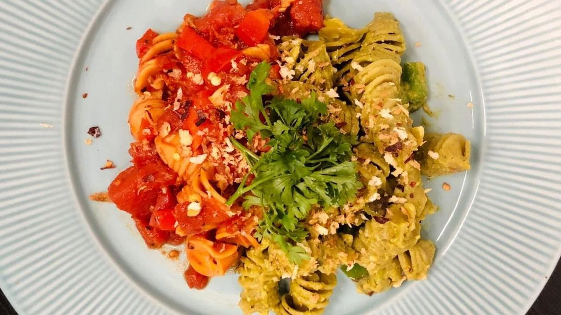06. Arrange red and green pasta on a plate. Serve with parsley.
