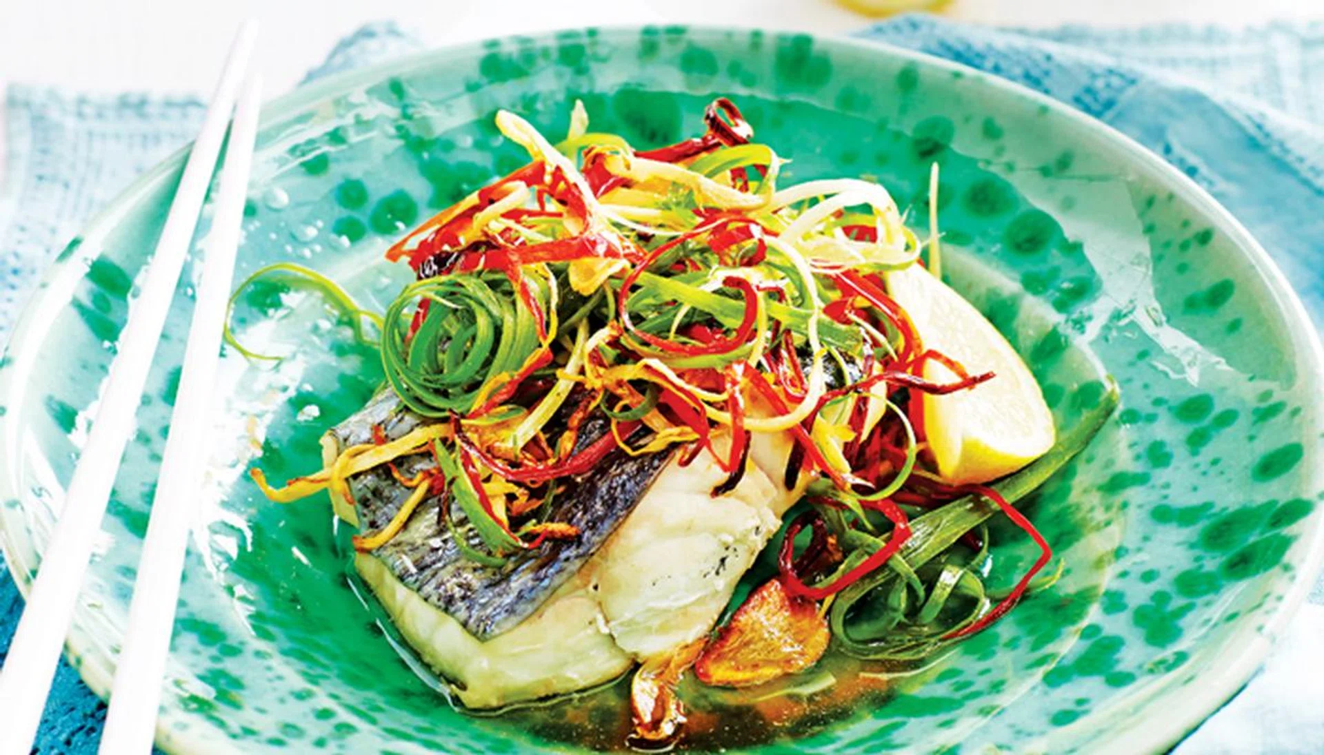 03. In a wok, heat peanut oil and extra sesame oil on high. Stir-fry ginger, chilli and garlic 1 to 2 mins. Remove from heat and toss onions through. Spoon over fish and serve with lemon.