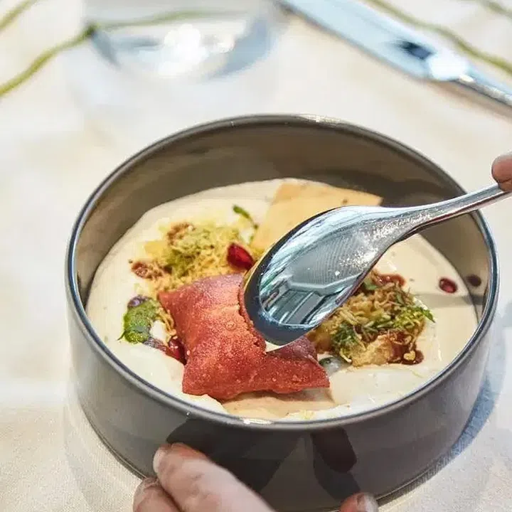 She walks us through the rich and colourful stories behind her collaboration with Yantra, starting with the Chaat Banarasi. A visually striking combination of potatoes, chana chaat (cooked chickpeas with fresh onions, tomatoes, tamarind chutney), pomegranate, housemade chutneys and crisps, the dish is set against a white canvas of aerated yoghurt.