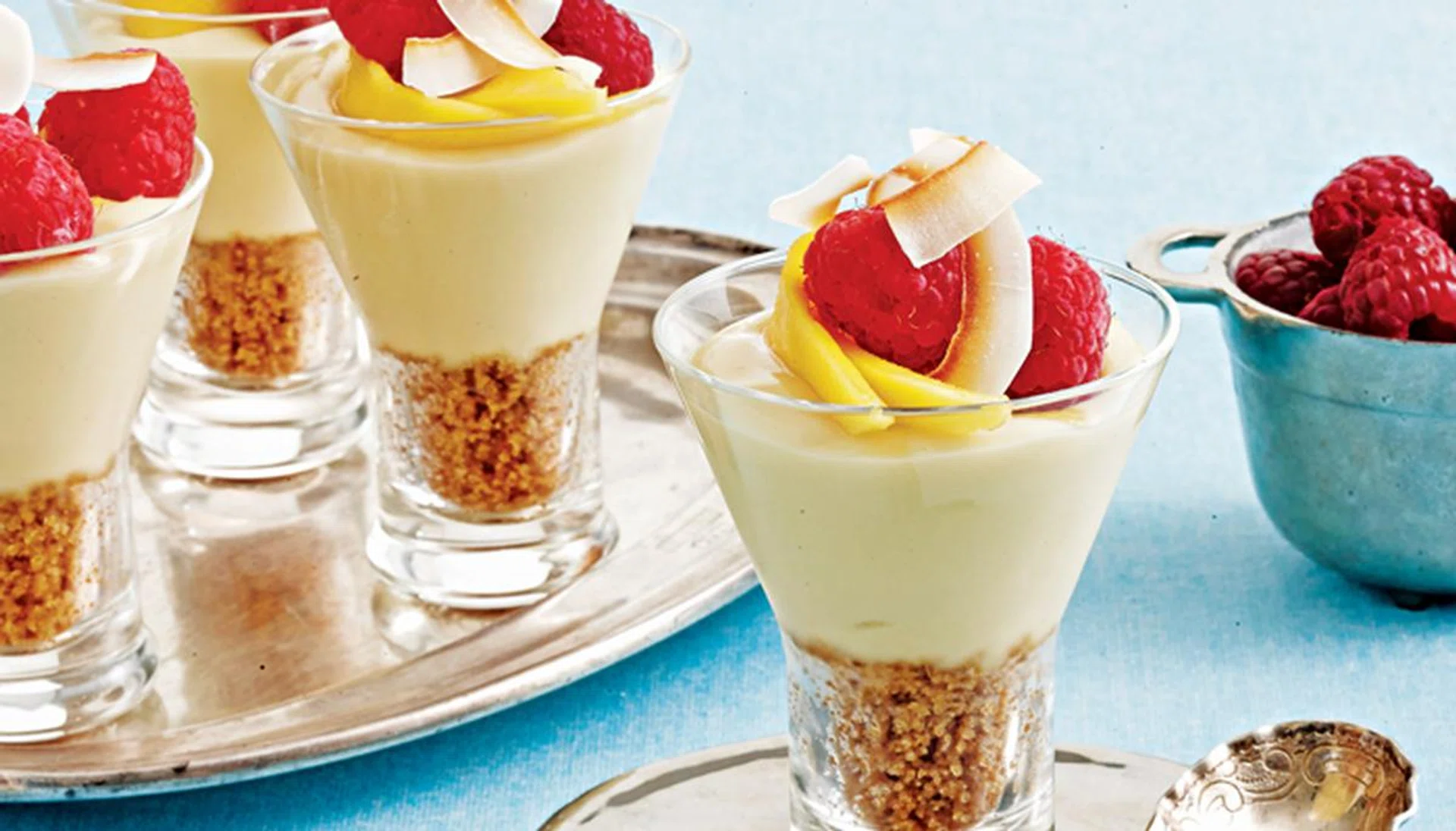 03. Pour custard filling evenly among 12 serving glasses and chill for 2 hours. Top pots with sliced mango, raspberries and coconut.