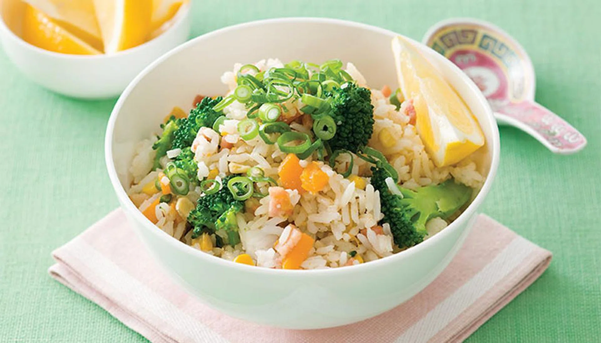 03. Spoon rice into serving bowls. Top with onion. Serve with lemon wedges on the side.
