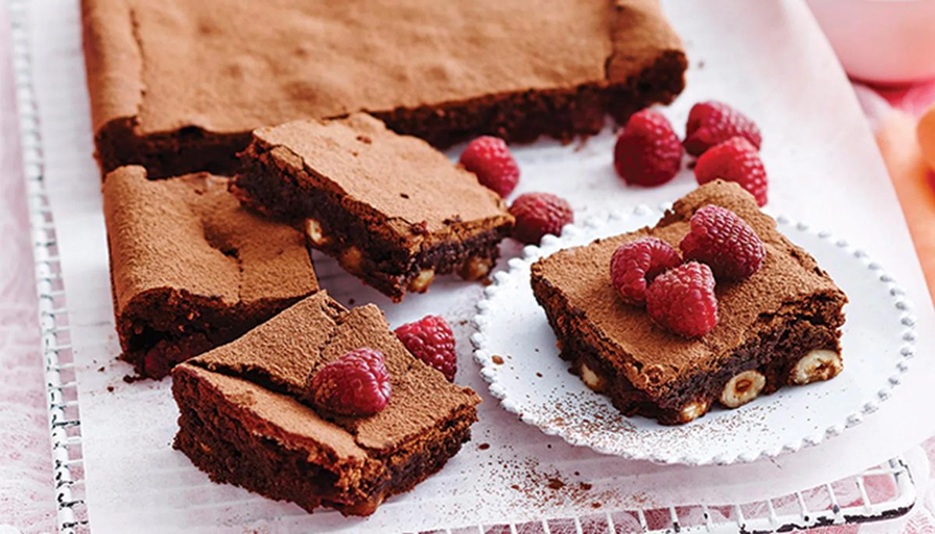 05. Scatter hazelnuts and raspberries over base of tray. Pour in batter. Bake 35 to 40 mins until just firm. Cool in pan. Serve dusted with cocoa and topped with extra raspberries.