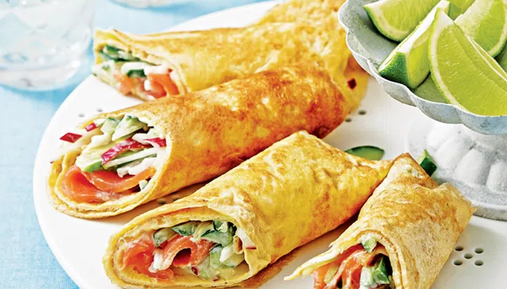 A combination of Western and Eastern flavours and ingredients, this has smoked salmon, avocado and wasabi mayo wrapped in a thin egg omelette. Plus, it packs plenty of protein to help keep you full for longer.