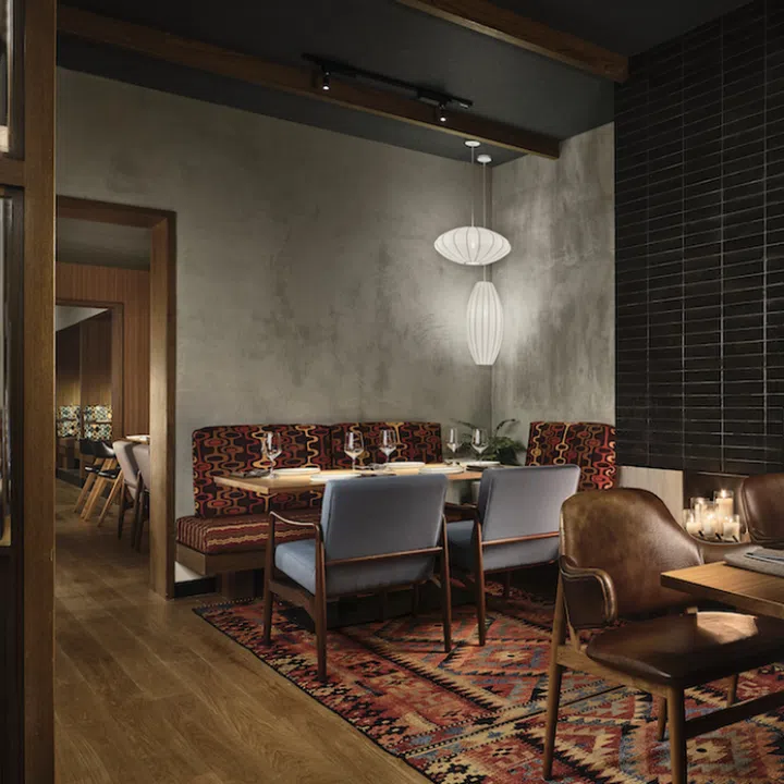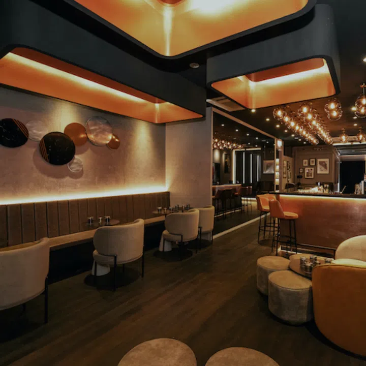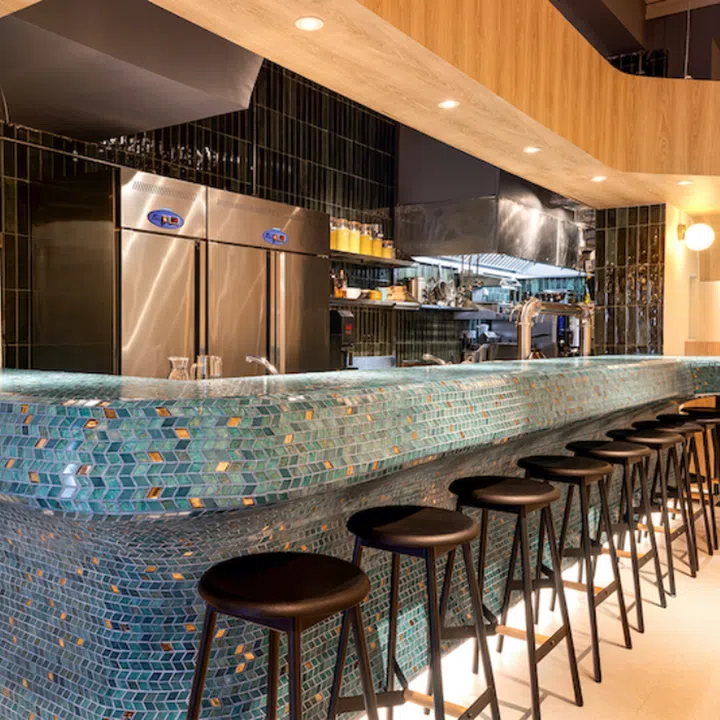 Besides innovative cocktails, the food menu offers Japanese-European creations such as ceviche of scallop, octopus and tuna perfumed with citrus, pan-seared rosemary foie gras, and wagyu tataki.