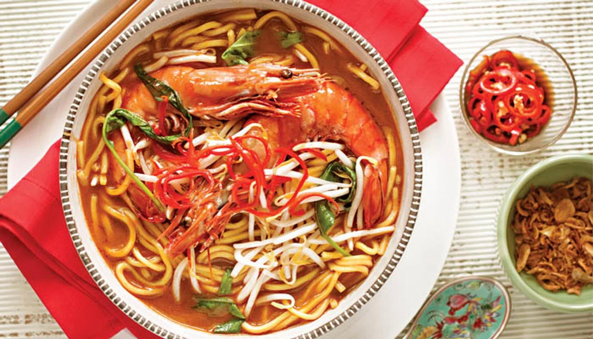 08. Serve noodles topped with soup, bean sprouts, kangkong, sliced pork and prawns.