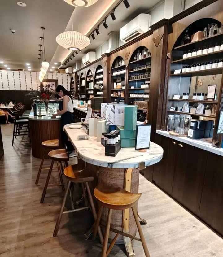 The charming space, decorated with bee motifs and pastel bird-adorned wallpaper, evokes a vintage, apothecary-style aesthetic with its dark wood furnishings. It doubles as both a retail space for its honey products sourced from South Western Australian forests, so you'll see jars of honey lining the shelves. On the menu, there's a compact selection of drinks and bakes. The only drawback? Seats are limited, and suited for individuals (great for me-time!) or smaller groups.