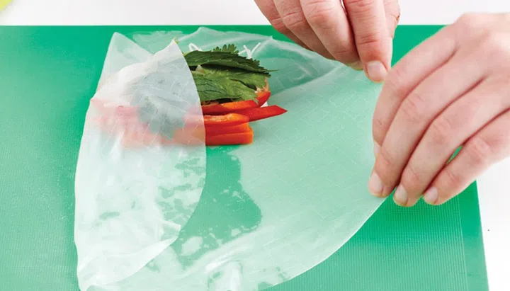Fold both sides of the rice paper carefully over the filling.