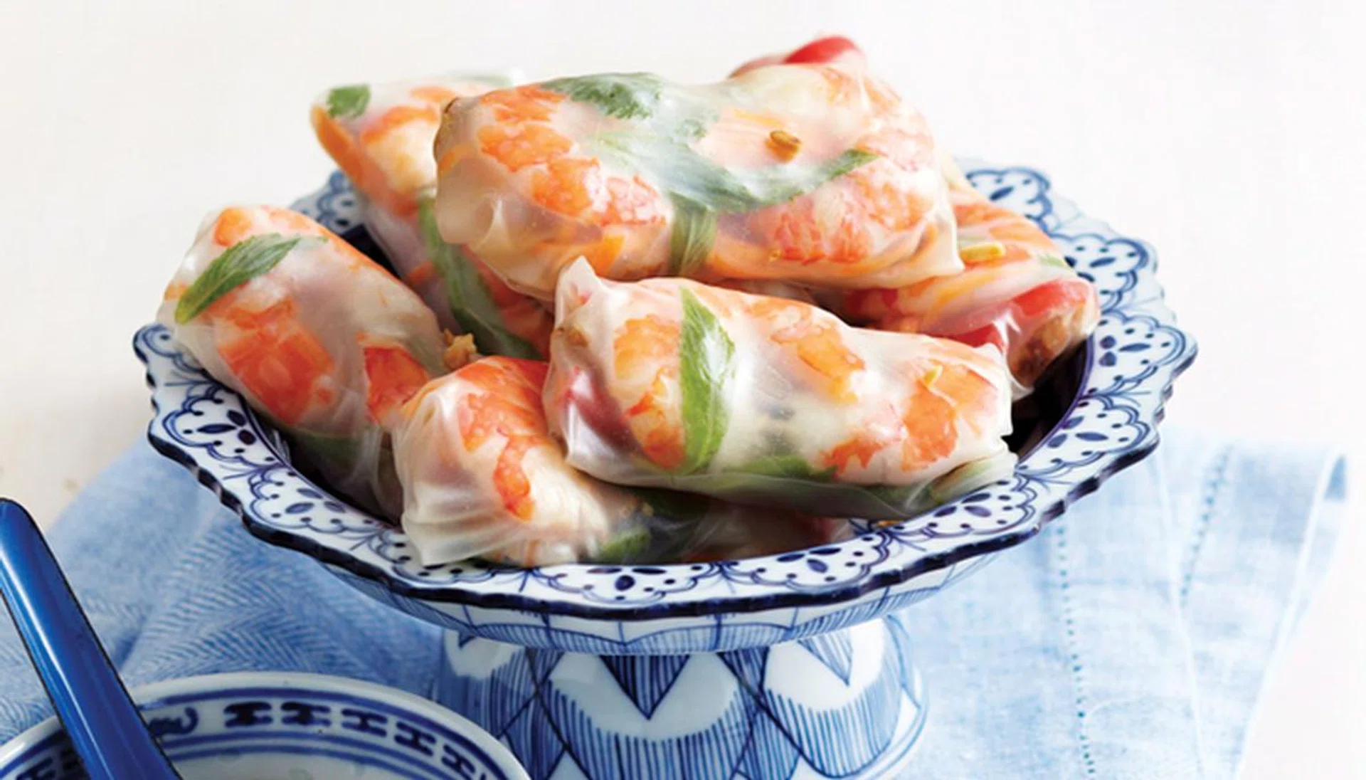 Place 2 prawn halves, lengthways, 2 cm from edge facing you. Top with 2 pork slices, a small amount each of noodles, vegetables and herbs.