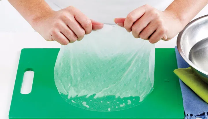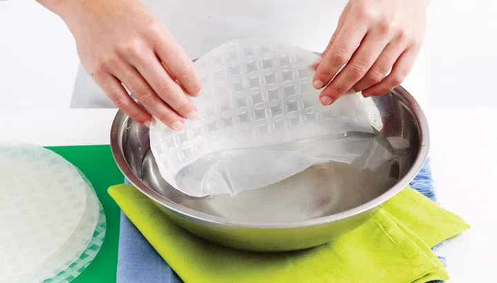 Working with one rice paper sheet at a time, soak in a bowl of warm water, 20 to 30 secs, until the rice paper just softens.