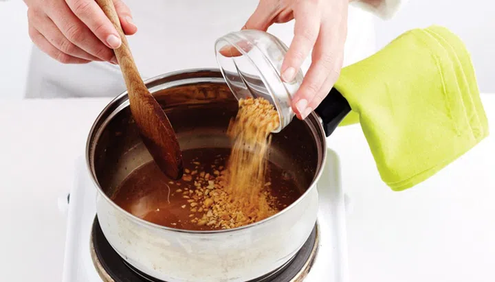 To make dipping sauce, combine hoisin sauce and milk in a small saucepan. Stir over low heat to combine. Stir in nuts.