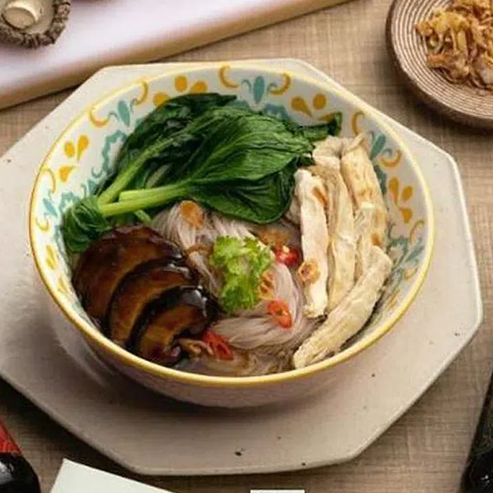 7. Garnish with chicken, mushrooms, green vegetables, shallot crisps, fresh coriander and chopped chilli before serving.