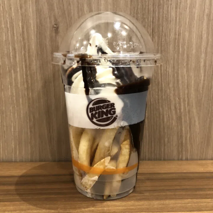 If you can't already tell from the photo, the dessert features french fries draped in soft-serve ice cream and topped with a messy dash of chocolate sauce.