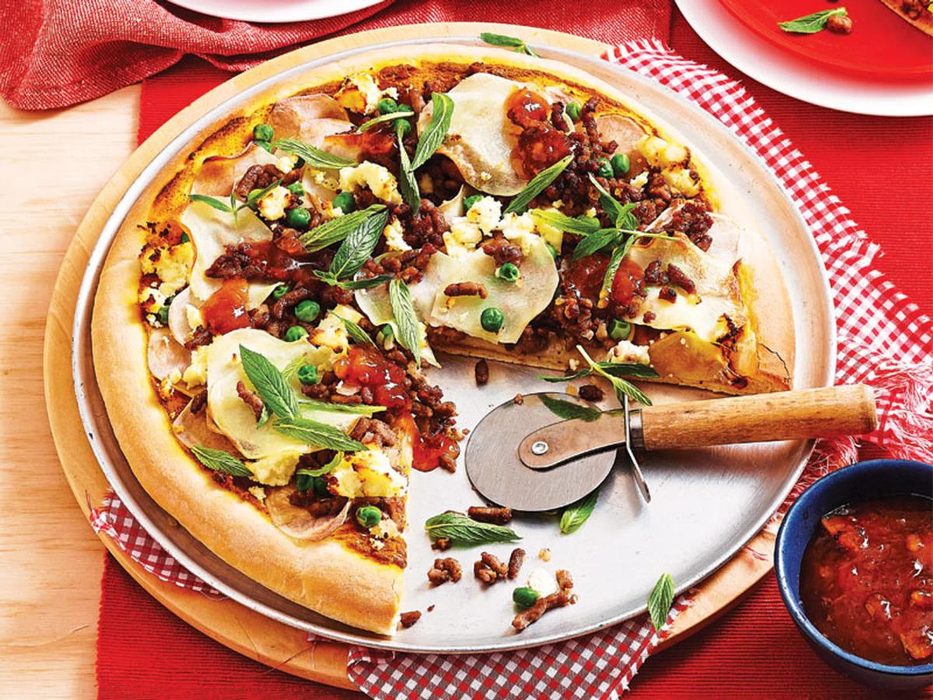 07. Sprinkle half paneer over pizza bases. Top with mince mixture and remaining paneer. Bake 5 – 8 mins until golden. Slice pizza and top with mint and chutney.