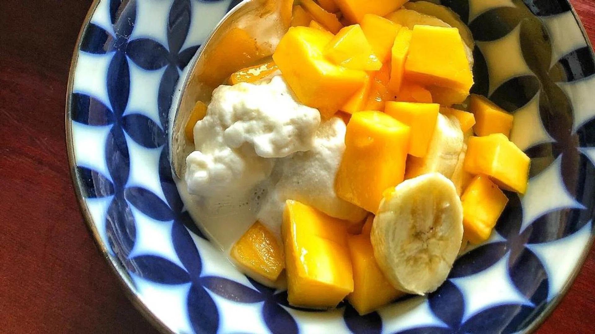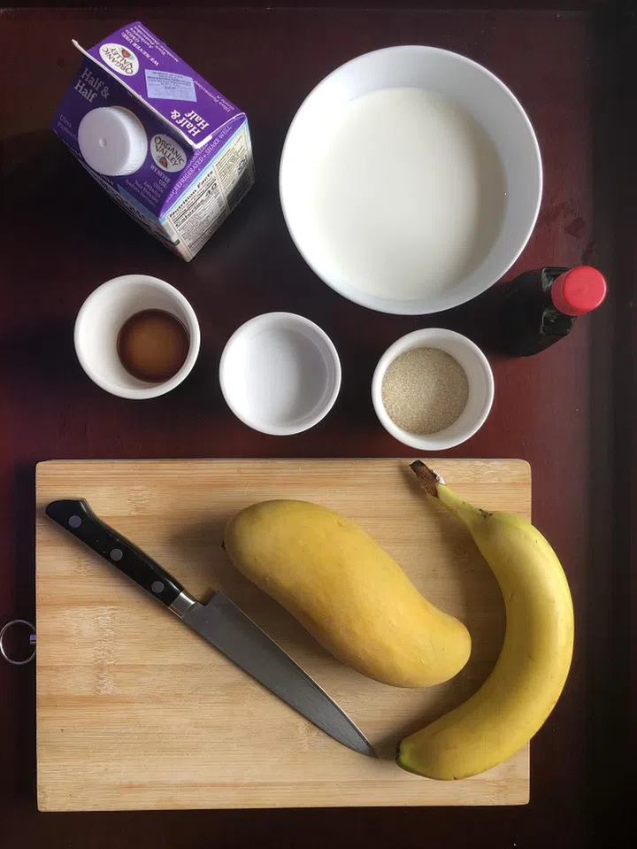 01. Slice fruit and get your serving bowls ready. This ice-cream is fast to make and equally fast to thaw – so you need to be ready to serve it immediately.