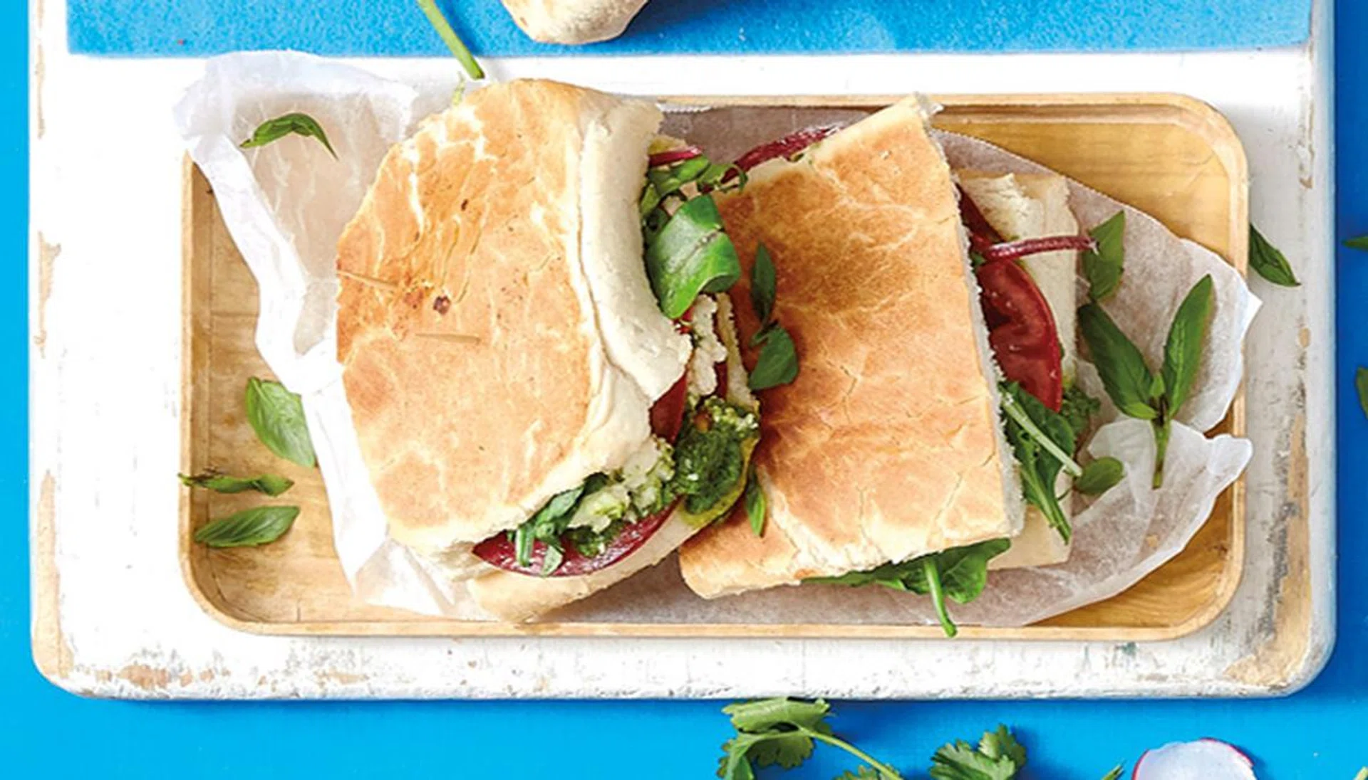 The flavours of Italy are captured in between the garlic sourdough bread with sliced salami, basil leaves and fresh ricotta.