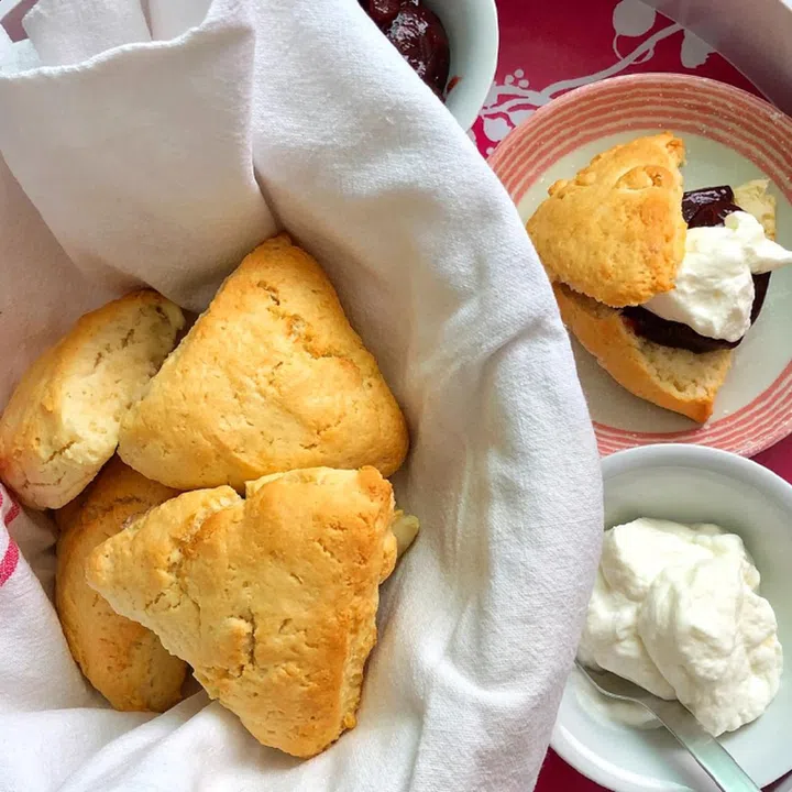 5. Bake for 15 to 18 minutes, or until the tops are golden. Remove from the oven and cool on a metal rack. Serve warm, with clotted cream or butter and jam.