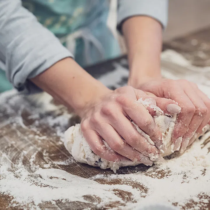2. Place the flour in a large mixing bowl. Make a well in the centre, add the 90ml of whipping cream, then the soda. Mix with a fork to form a dough and knead very lightly, just to bring the dough together. Do not overwork the dough (photo 1).