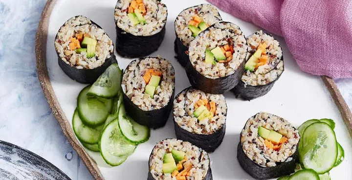 This recipe come with lots of healthy ingredients like quinoa, brown rice, barley, avocado and cucumber, and it looks like sushi! Make it heartier by adding tuna flakes.