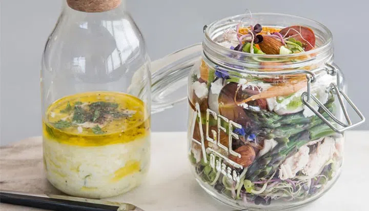 Pack leftover chicken, vegetables and herbs in a jar, whip up a yoghurt dressing then serve it to the kids as a fresh, healthy snack when they need it.