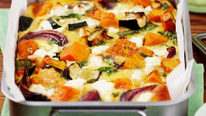 This versatile dish is great for breakfast, lunch or dinner, and is packed with loads of veggies to hit your fibre needs - plus a little bit of indulgence thanks to cream and feta. This recipe calls for pumpkin, zucchini, and spinach, but you can toss in leftover baked veggies, or broccoli, capsicum, and mushrooms.