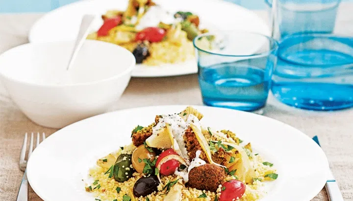Why call takeout when this falafel couscous plate, packed with European flavours, only takes 10 minutes to put together! You got to try it to believe it.
