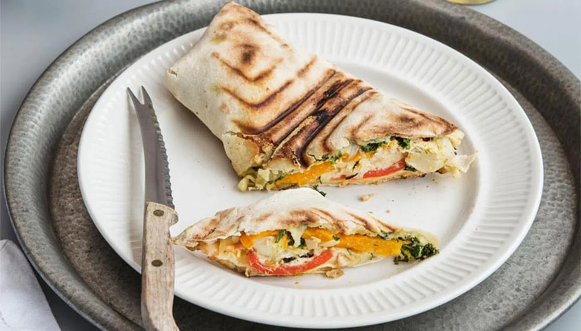 This make-ahead wrap recipe is the lunch solution you've been looking for. Simply assemble at home, then pop in the sandwich press at work to get warm and cheesy. It's also a great way of using up leftover roast veges. Win win!