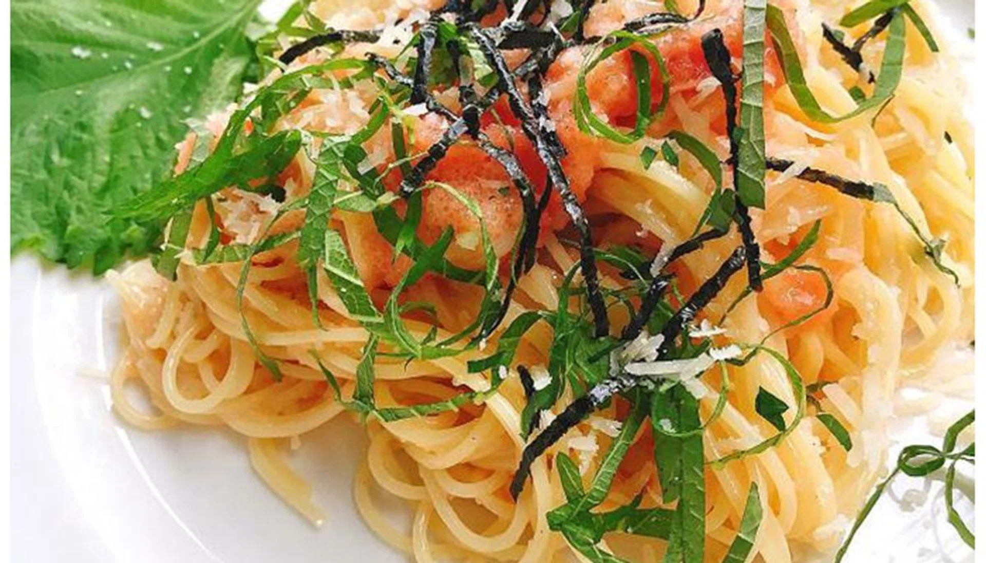 09. Transfer the pasta onto a plate. Place the remaining mentaiko on top. Garnish with finely sliced shiso, nori strips and Parmigiano-Reggiano shavings.