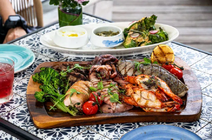 Think chargrilled butterflied prawns, grilled octopus, fresh market fish, whole squid, oven-baked cheesy chicken roulade with Kefalotyri, and New Zealand Silver Fern bifteki, complemented by zesty sauces like tzatziki, lemon mustard, and pesto. On the side, bites like chargrilled baby gem, broccolini, and cherry tomatoes on the vine.