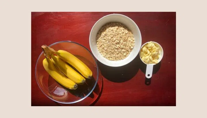 The three ingredients: banana, oats and chocolate chips. Credit: Tara Barker