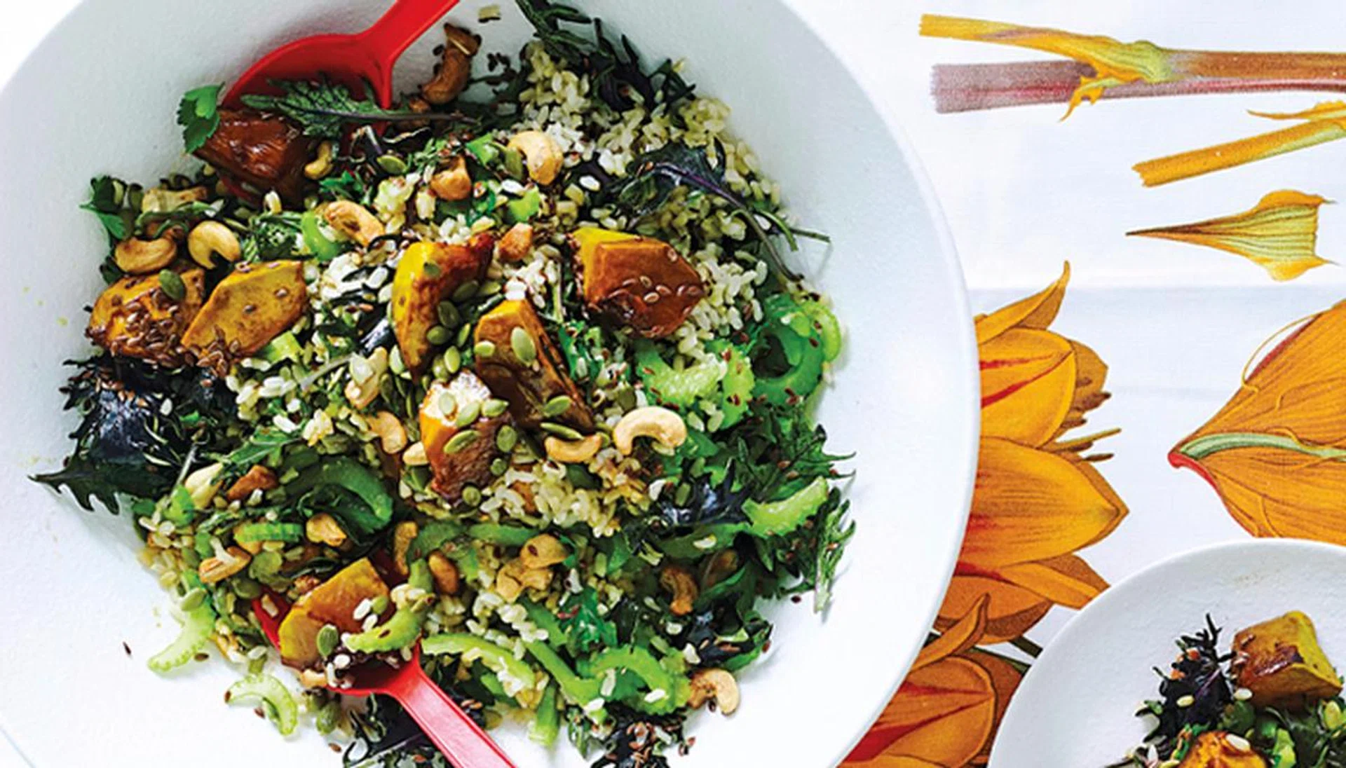 Wholesome brown rice pairs fantastically with fragrant Japanese pumpkin in this nutritious salad that also contains lots of seeds and greens.