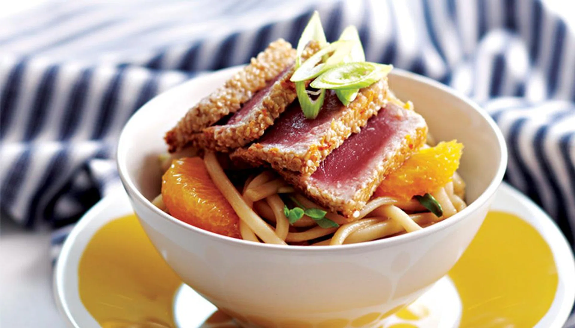 04. When ready to serve, pour dressing over noodles. Add sprouts, orange segments and spring onions, tossing to combine. Serve noodles topped with tuna slices.