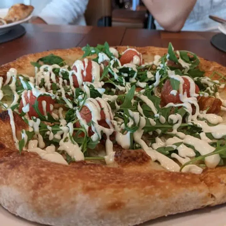 Encircling the pizza crust is a puffy and airy cornicione that has been baked brown evenly in the woodfired oven with California almond wood, which is known for its fruit-forward wood flavour.