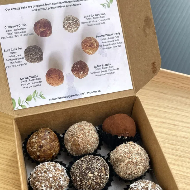 The vegan energy balls from home-based outfit V:Pantry come in six flavours - three premium (Stay Chia-ful, Cranberry Crush and Cocoa Truffle) and three basic (Loco For Coconut, Peanut Butter Party and Rollin' In Oats).