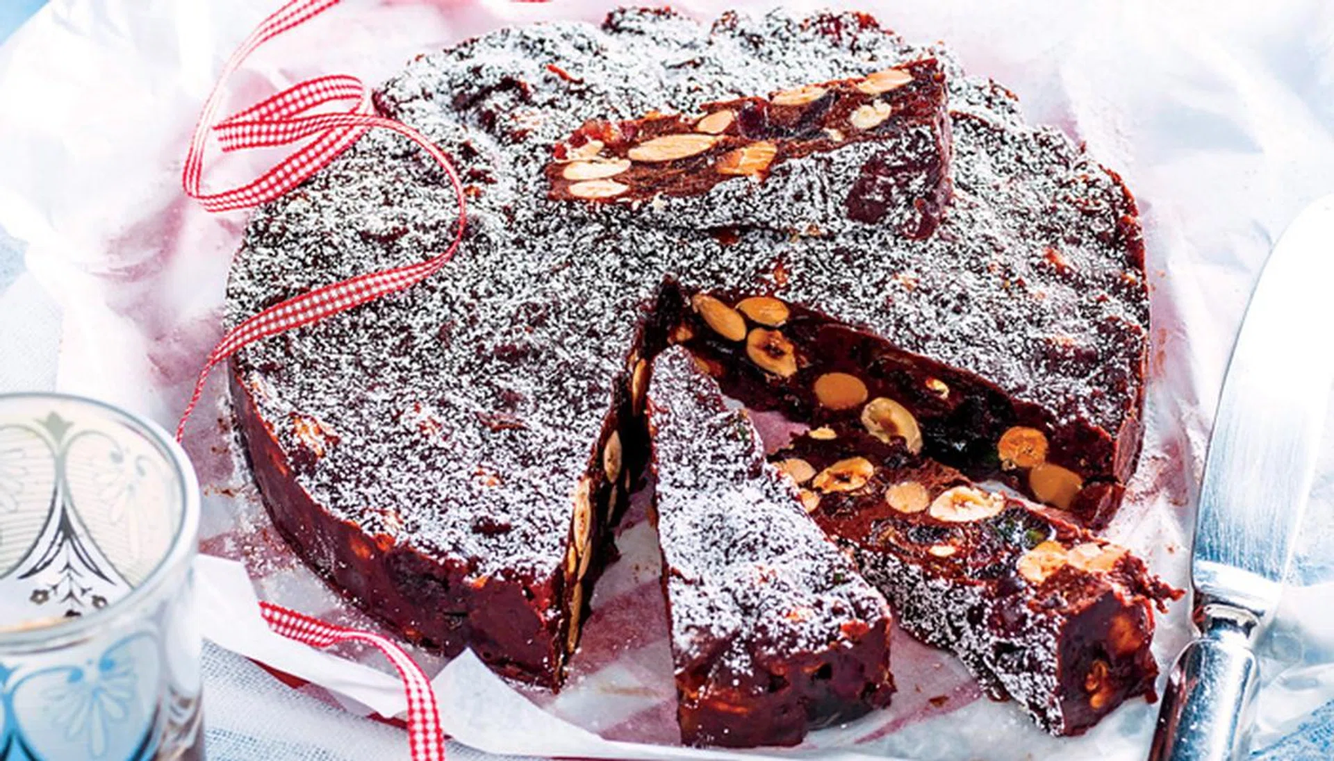 A traditional Italian dessert, this panforte incorporates fruits and nuts with an undertone of spice and is topped with a nut and caramel mixture.
