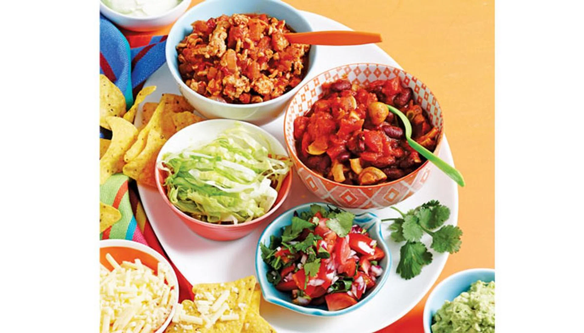02. Serve chicken and veggie mixtures on a platter with guacamole, salsa, corn chips, lettuce, cheese, sour cream and fresh coriander sprigs.