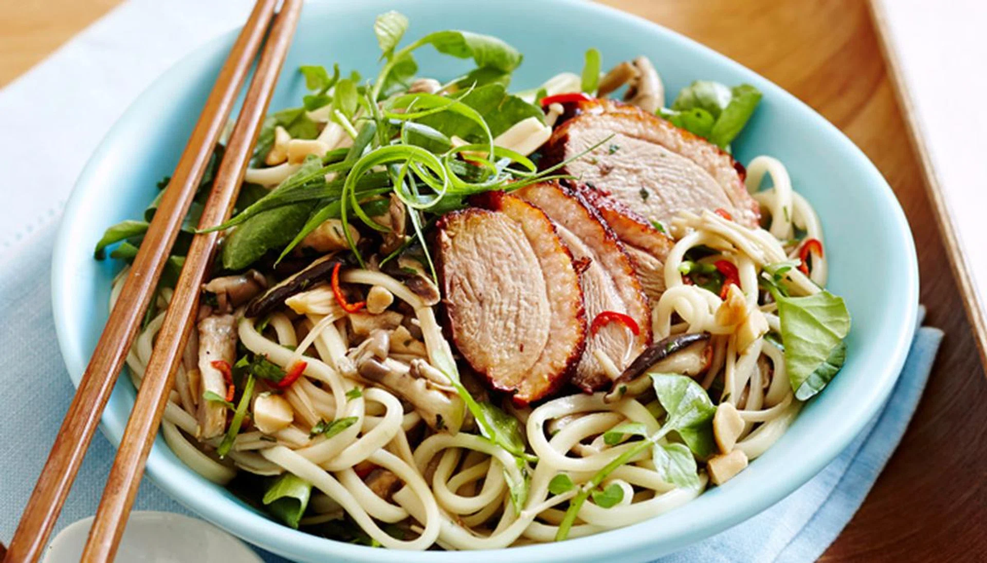 05. Drain noodles. Return to pan. Add mushroom mixture, watercress, onions and sesame oil. Toss to combine. Top with sliced duck and sprinkle with nuts and extra onion to serve.