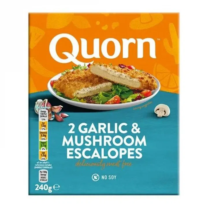 The garlic & mushroom escalopes from Quorn consist of ‘meat’ encased in a crunchy breadcrumb coating and topped with a garlic and mushroom sauce.