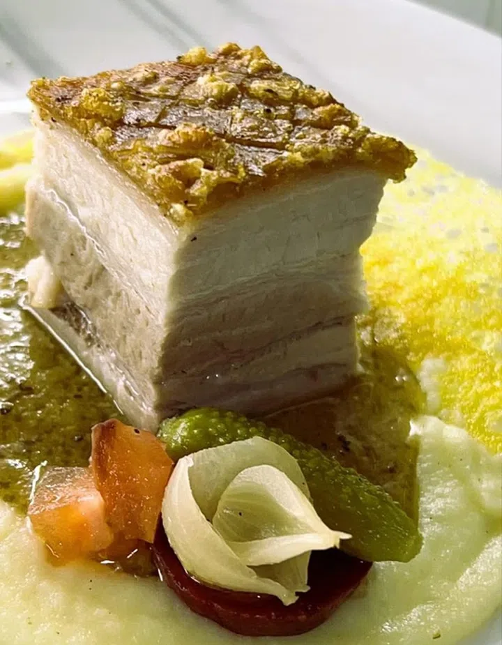 Pressed belly of pork (free range): “Three-hour oven-cooked free-range pork belly, crackling on the outside, juicy as you bite. Served with a garlic reduction sauce.”
