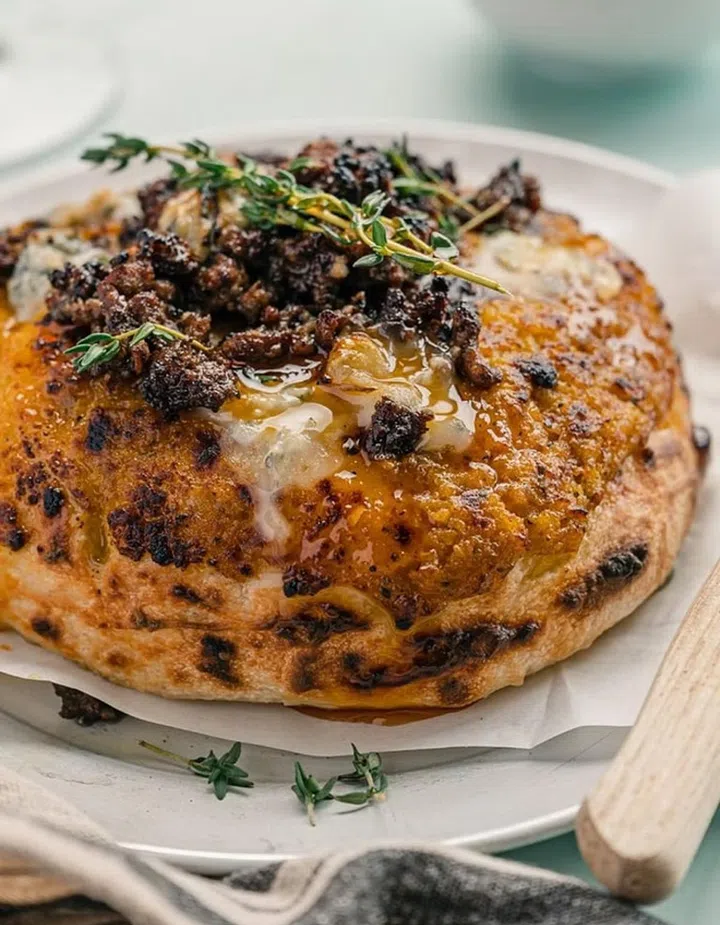 Bread: “This bread (pictured) is made from dough that has been fermented for 72 hours and uses a five-year-old starter, pumpkin pesto that’s been fermented for 75 days, crispy wagyu beef, Gorgonzola cheese sauce and chilli oil.”