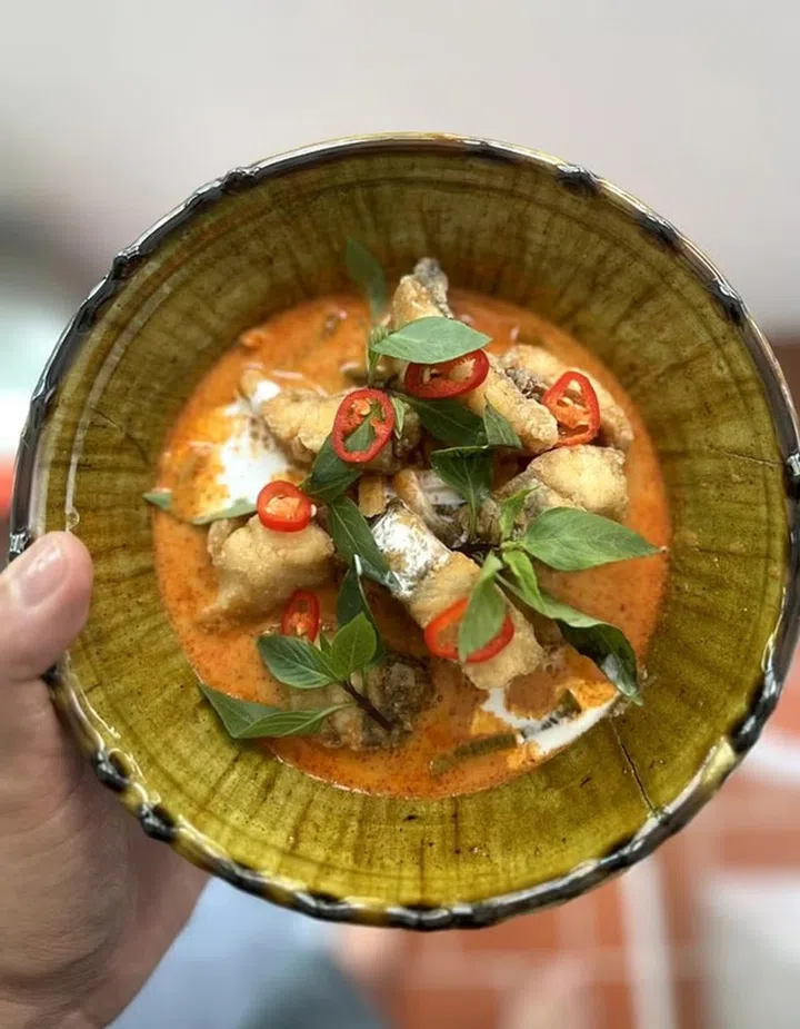 Panang pla: “Red curry with crispy seabass (pictured). This is something we ate a lot of growing up. It’s a red curry made with bamboo shoots, baby eggplants and topped with crispy fish. It’s hearty and rich and you can keep going if there’s a bowl of rice to accompany the curry.”