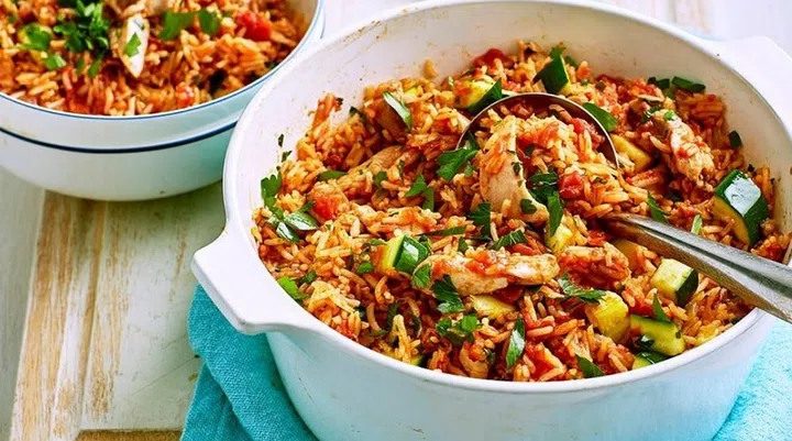 Nothing beats feeding a big family with a warming and tasty one-pot recipe. This dish features tomatoes, zucchini, chicken and other components of a comforting meal.