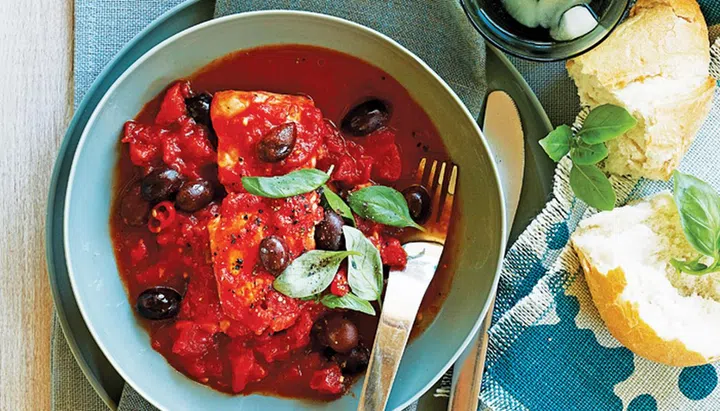 This one-dish recipe features poached fillets of fish (it's best to use firm-fleshed white fish like sea perch, barramundi) served simmered in a traditional Italian tomato, basil, and olive sauce. (Puttanesca is a tomato-based sauce given salty flavours from ingredients such as olives and capers.) Super satisfying yet incredibly simple to make. It's best served with bread to soak up all the sauce.