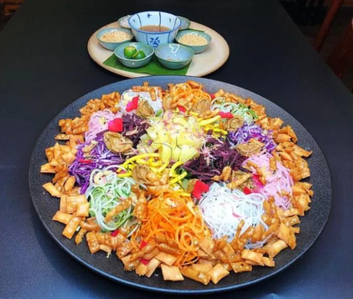 For something a little more exotic, there's the Fugu (Japanese Pufferfish) Yu Sheng with ice plants, edible flowers, and fresh greens in the shape of a rabbit.