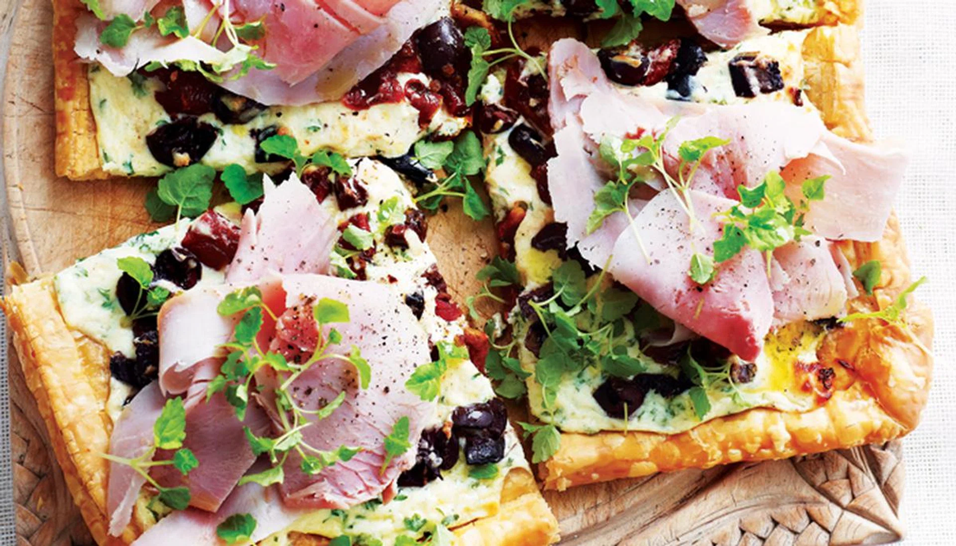 05. Remove the pastry from the oven and top with the ricotta mixture. Press the olives and tomatoes into the ricotta, then return to the oven for a further 15 mins. Remove from the oven and transfer to a serving platter.